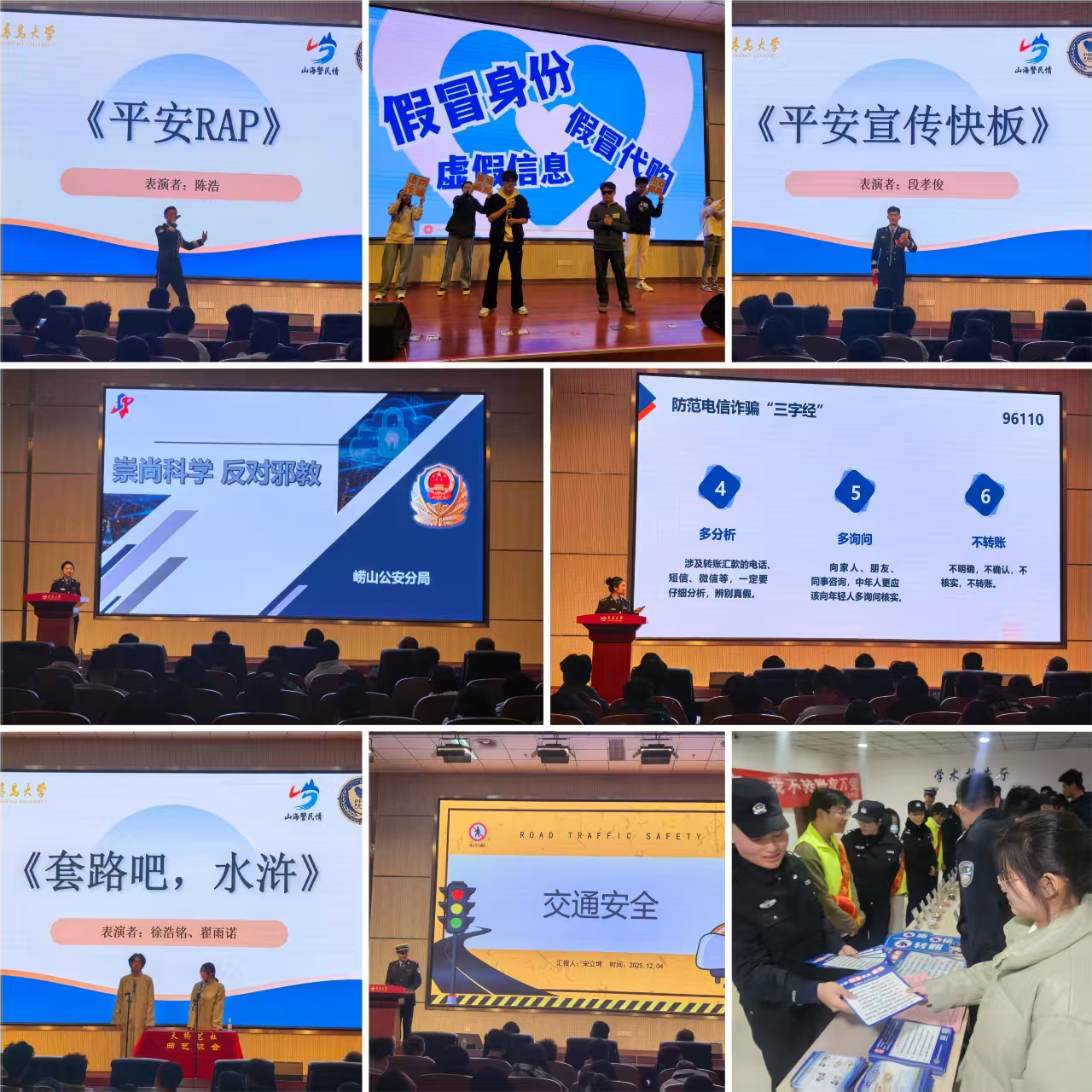 为深入推进法治校园建设,提升学校师生法治意识和安全防范能力,12月4日,青岛市公安局崂山分局组织“山海警民情” 工作团队走进我校,开展了一场别开生面的“警校携手,共筑平安”主题普法宣传进校园活动。此次活动旨在通过“宣讲+节目+互动”的立体化模式,面向广大师生开展安全知识普及,将法律知识融入具体情境,为师生们带来了一场别开生面的“法治盛宴”。
