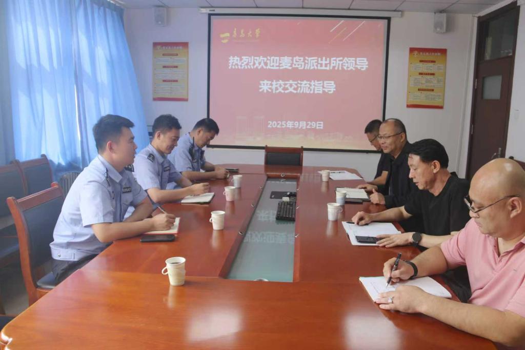 9月29日上午,青岛市公安局崂山分局麦岛派出所所长吴晓伟、副所长于文卿,辖区民警綦翔一行3人莅临我校,就警校协同推进高校意识形态安全、学生安全管理及校园周边环境治理等重点工作进行专题调研。校安全管理处处长王洪运、副处长武瑞斌及相关科室负责人参加座谈会。